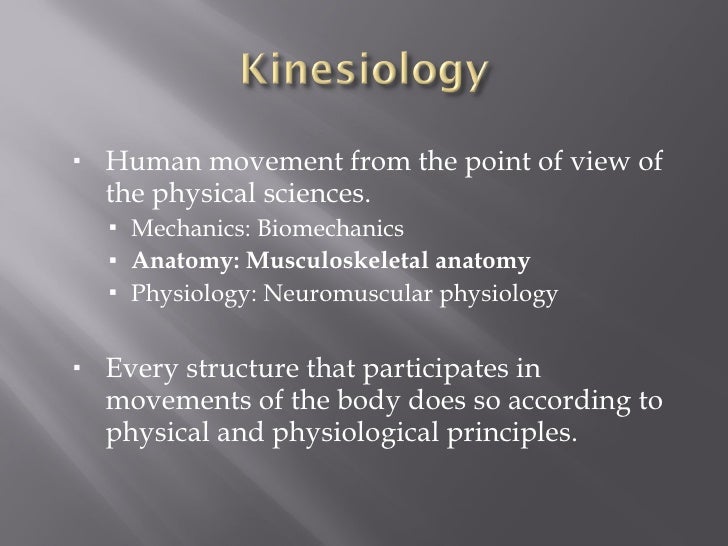Chapter 1 Foundations of Structural Kinesiology Biology Diagrams Kinesiology is the study of human movement and within the field, individuals learn how these movement mechanisms affect the body and how exercise can improve the overall human health condition. Kinesiology students gain an understanding of the physiological, biomechanical and psychological elements related to human movement and how to apply that knowledge to improve health and wellness. The